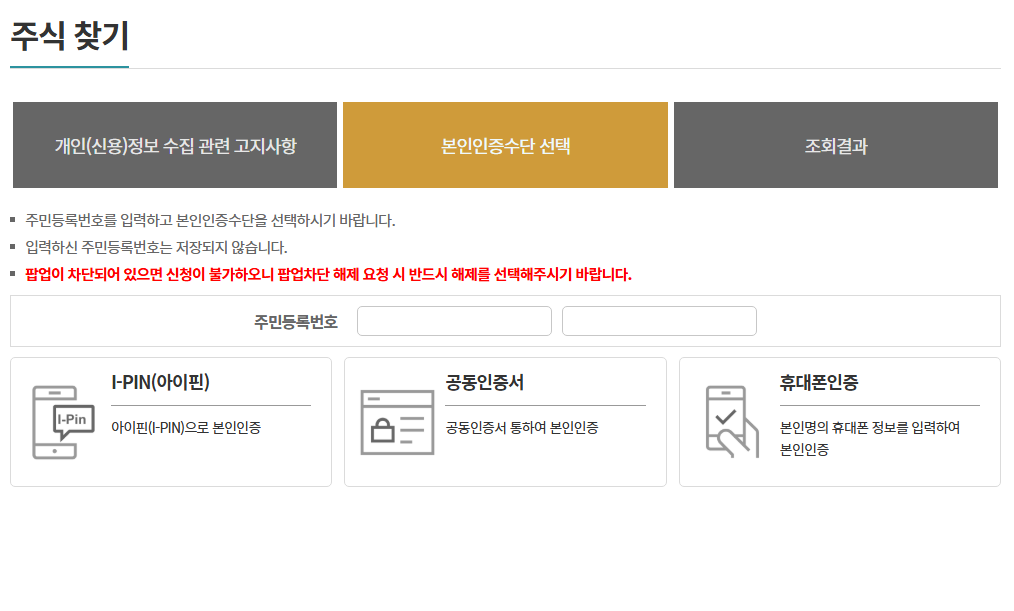 주식을 확인하기 위해서는 본인인증 절차를 거쳐야합니다. 방법은 "I-Pin, 공동인증서, 휴폰인증"을 통하여 진행이 가능하빈다. 본인인증절차를 끝내면 보유 중인 나의 주식 현황을 확인할수 있는데 아쉽게 저는 하나도 없네요. 만약 상속 주식이나, 미수령 주식이 있는경우에는 해동 내용이 나오니 한번 확인해보시기 비랍니다.