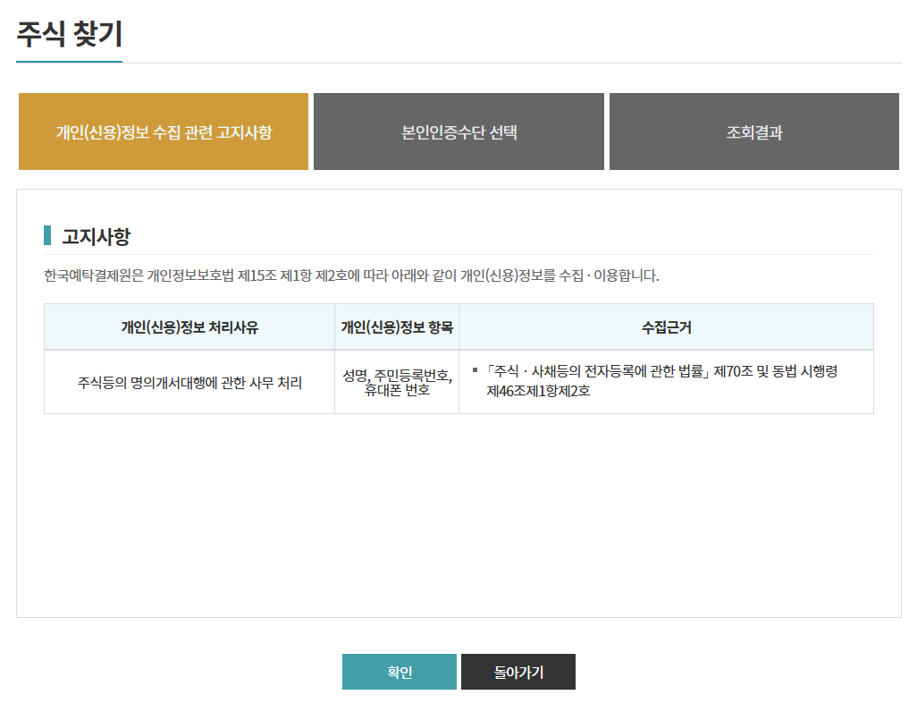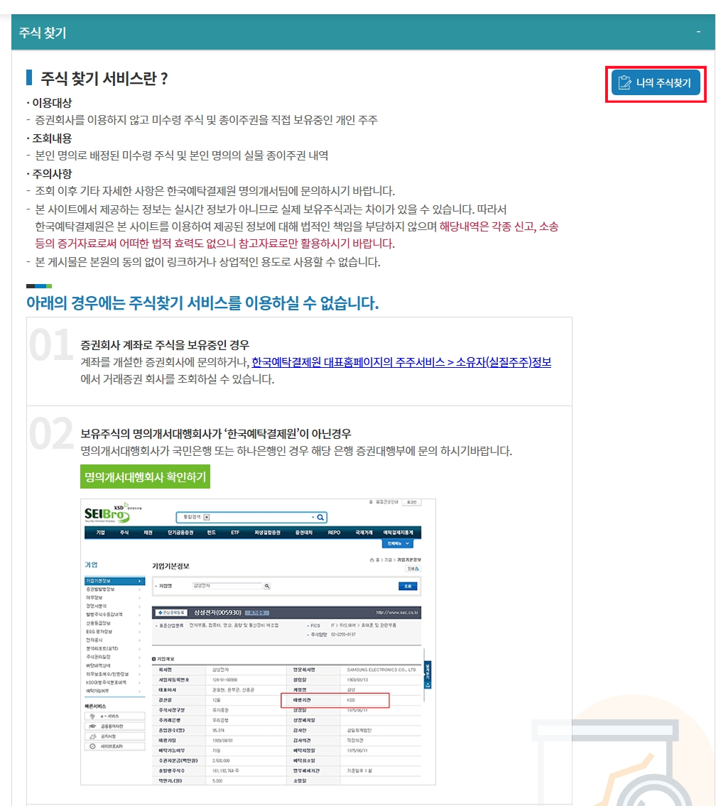 주식찾기서비스로 이동하게 자세한 설명이 나옵니다. 증권회사를 이용하지 않고 미수령 주식 및 종이주권을 직접 보유중인 개인주주들이 이용 대상입니다. 오른쪽 상단에 "나의 주식찾기"를 클릭하면 본인 인증 절차로 넘어가게 됩니다.