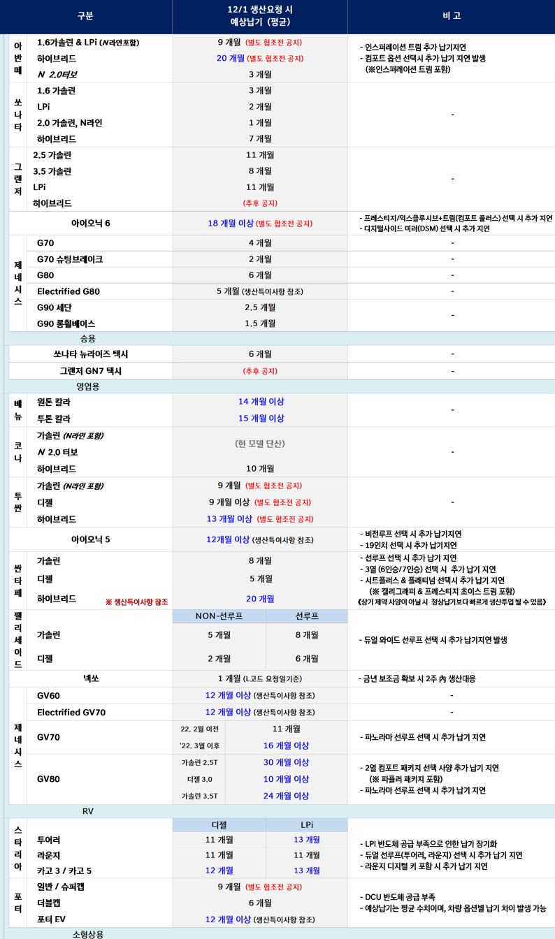 가장 깜짝 놀랐던것은 제니시스 GV80인데 다른 제네시스 모델도 1~2개월정도 납기일이 줄었지만 GV80 가솔린의 경우에는 납기일 12개월이나 줄었네요 기다리셨던 분들은 방가운 소식일수도 있을거 같습니다.
