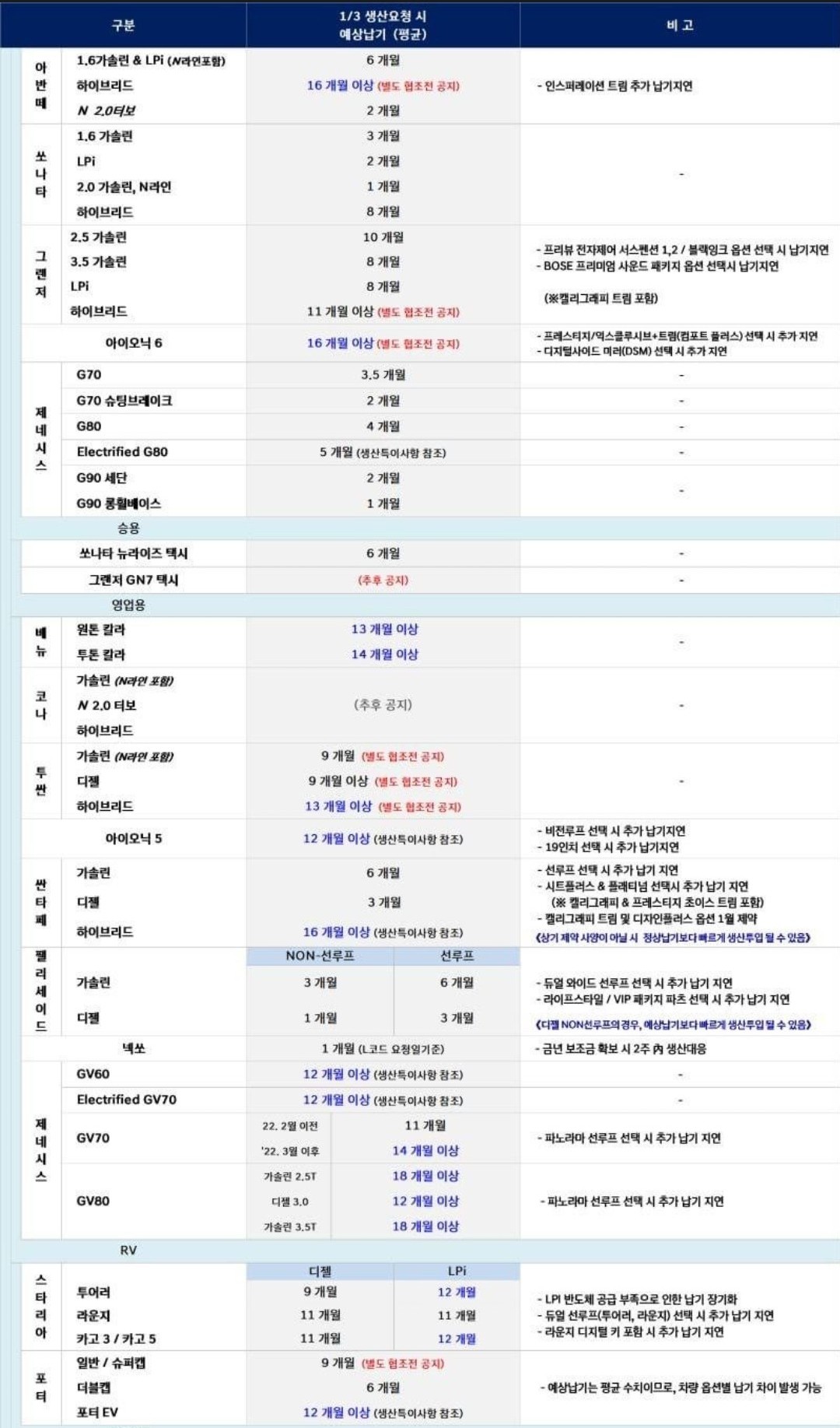 경기침체와 금리 인상으로 차량 주문이 점점 줄어들고 있다는것이 느껴지는 출고기간 납기 표였습니다.