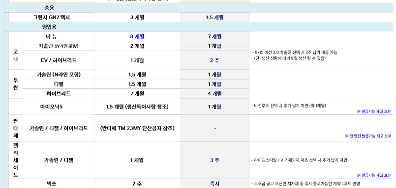 하이브리모델 제외하고 1~4개월내외 대부분 모든 차량 수령 가능합니다.