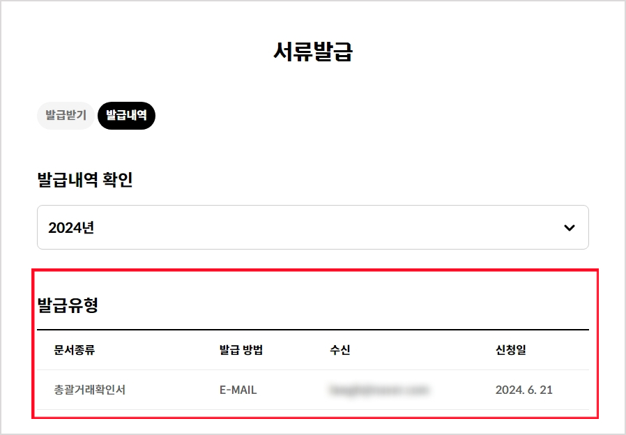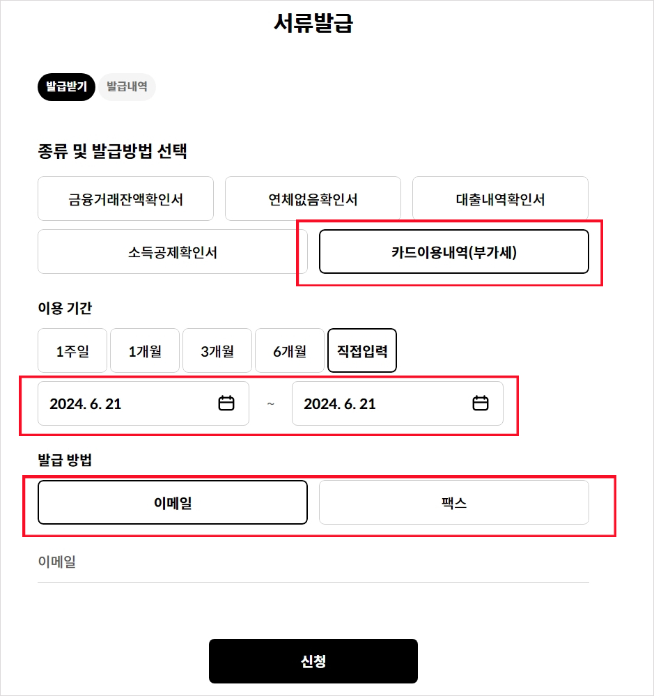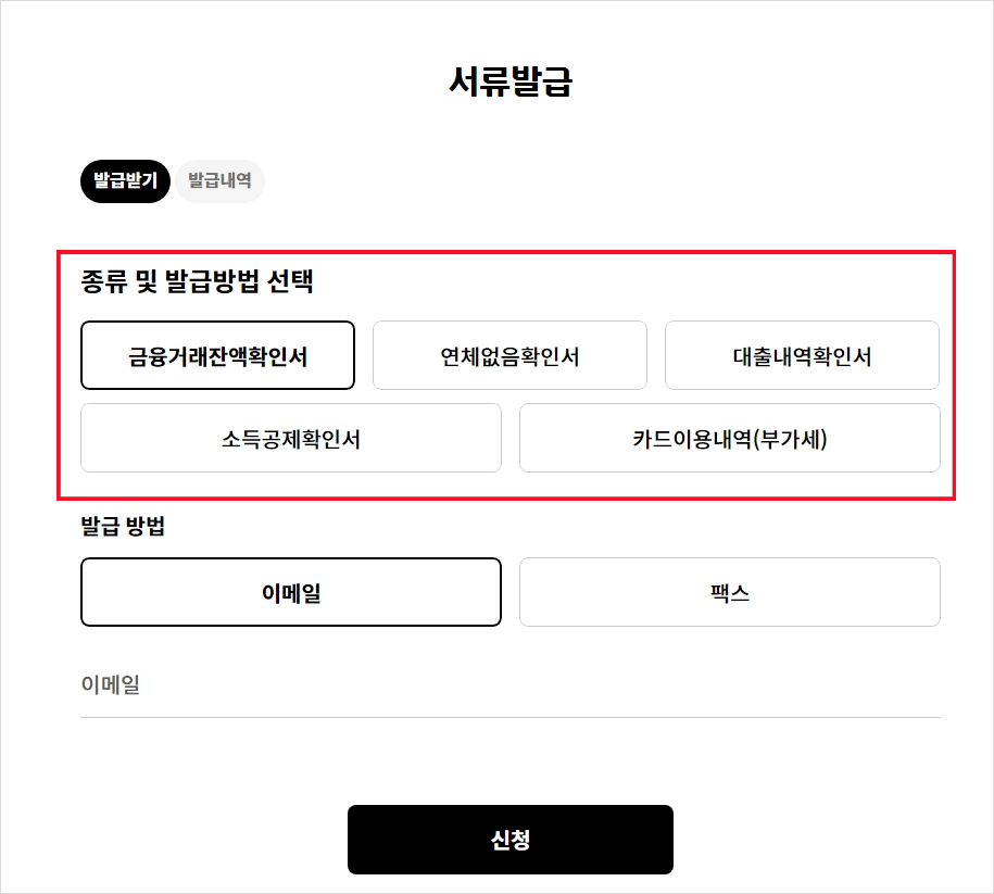 해당 카테코리에 들어가게 되면, 발급할 수 있는 기간과 발급방법으로 "이메일, 팩스" 중에 선택하여 발급받을 수 있습니다.