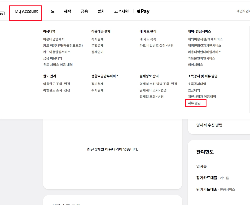 로그인 후에 My Account 메뉴를 클릭하시면 다양한 정보가 나오는데 그중에서 우리가 필요한 카드 거래내역 및 부채증명서 발급을 위해서는 서류 발급을 클릭하시면 됩니다.