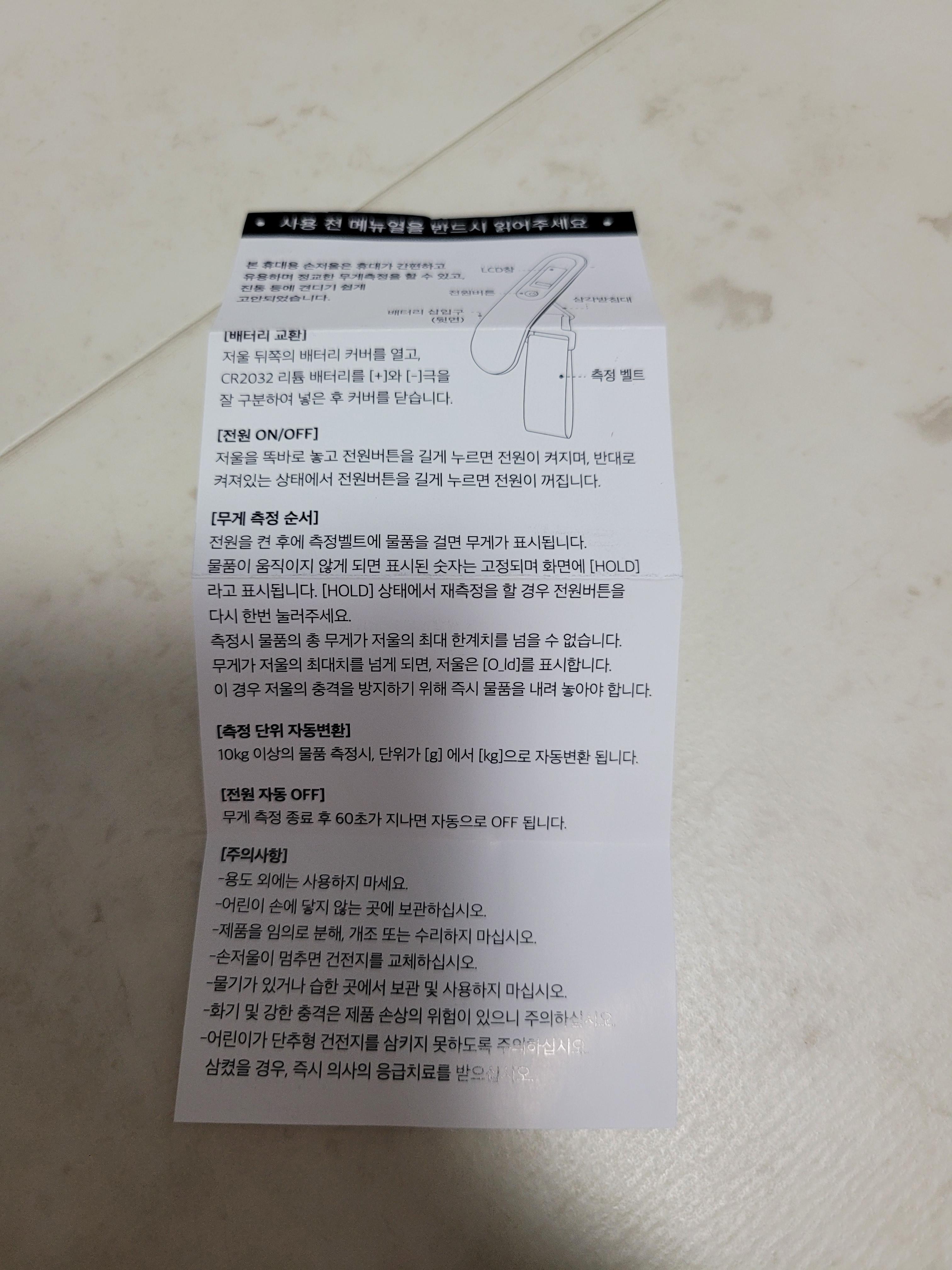 구성품은 저울 본품과 설명서, 그리고 건전지 하나 동봉 되어 있습니다. 보통은 건전지가 넣어서 판매하는 경우도 있는데 별도로 넣어야 합니다. 제품 자체가 너무 단순하기 때문에 설명서는 별로 읽지 않아도 사용하실 수 있습니다.