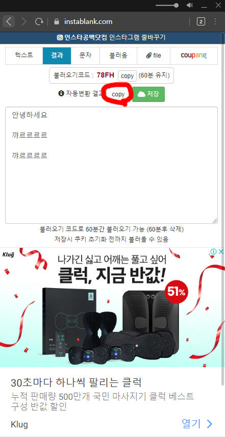 그럼 "결과" 화면이나오고 작성한 글을 그대로 복사할수있습니다