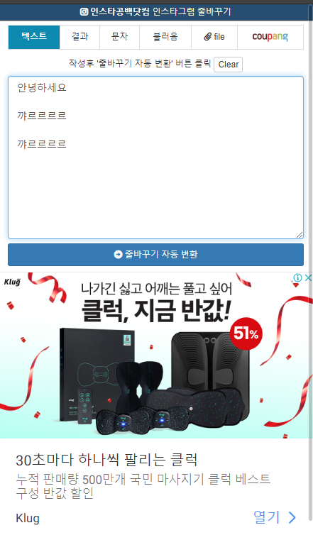 이렇게 뛰어쓰기를 다해서 작성하셨다면 "줄바꾸기 자동 변화"를 터치해주세요^^