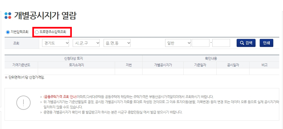 상단 우측에 보면 "도로명주소입력조회" 방법도 있지만 일반 토지 말고 "산"으로 체크해야 할경우도 있기 때문에 왠만하면 지번으로 하나씩 체크해서 하는게 좋습니다.