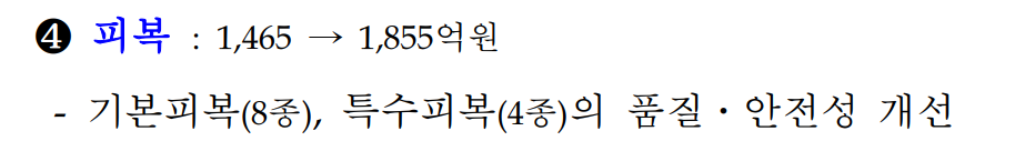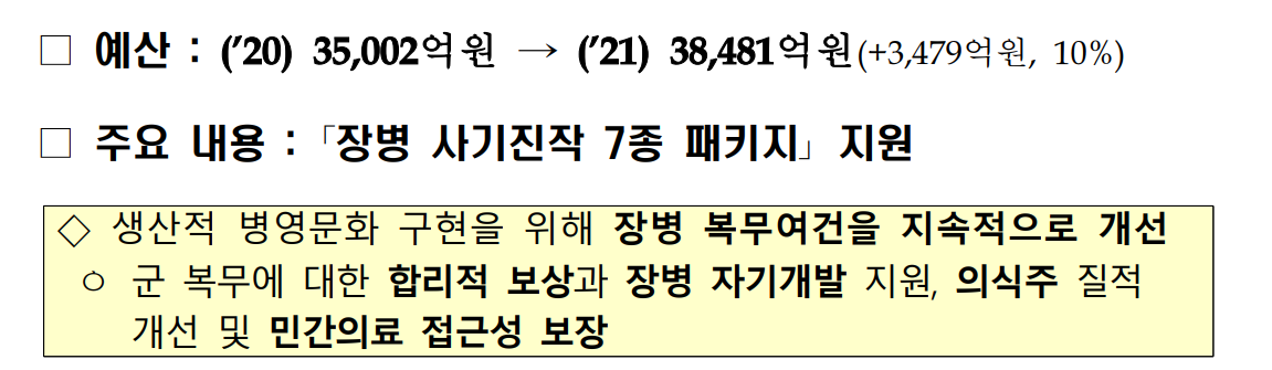 예산은 약 10% 인상 되었네요. 생산적 병영문화 구현을 위해 장병 복무 여건을 지속적으로 개선 하고 군복무에 대한 합리적 보상과 장병 자기개발 지원, 의식주 질적 개선 및 민간의료 접근성 보장을 위해 예산이 편성 됬다고합니다