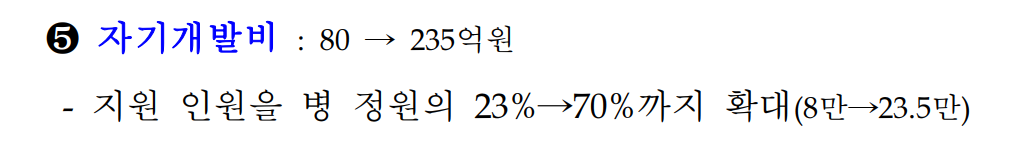 5번 자기개발비 지원 인원을 병 정원의 23% >> 70% 까지 확대한다고합니다 이건 많은 장병들한테 도움이 될거 같네요 군 제대 할때쯤 자격증 한두개정도 따서 나오면 좋거든요