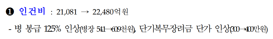 1번은 인건비!! 군인 월급 무려 12.5^ 인상 병장 기준으로 609000원!! / 단기복무장려금 단가 인상 400만원!