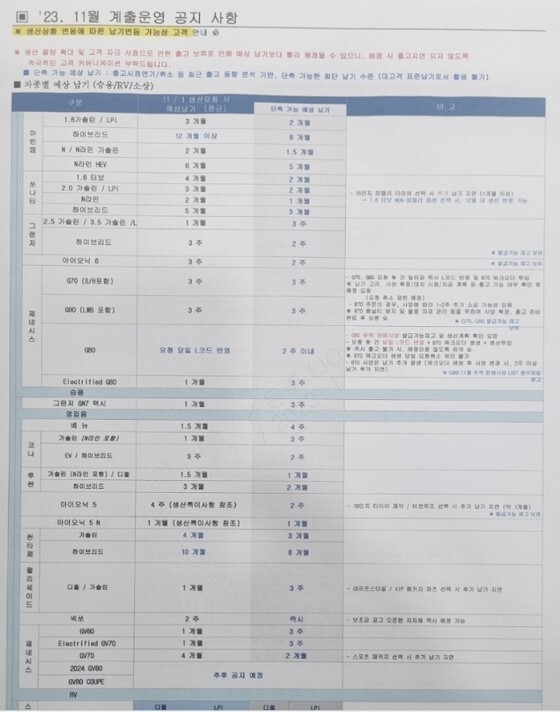 2023년11월 현대차 제네시스 신차 납기일 출고기간 정리해보겠습니다. 현재에는 하이브리드 모델을 제외하고는 거의 대부분 주문이후 2개월이내에 차량을 수령할수 있습니다. 하이브리드 모델 또한 전달 10갤도 있었으나 대부분 5개월 이내로 많이 단축되었습니다.