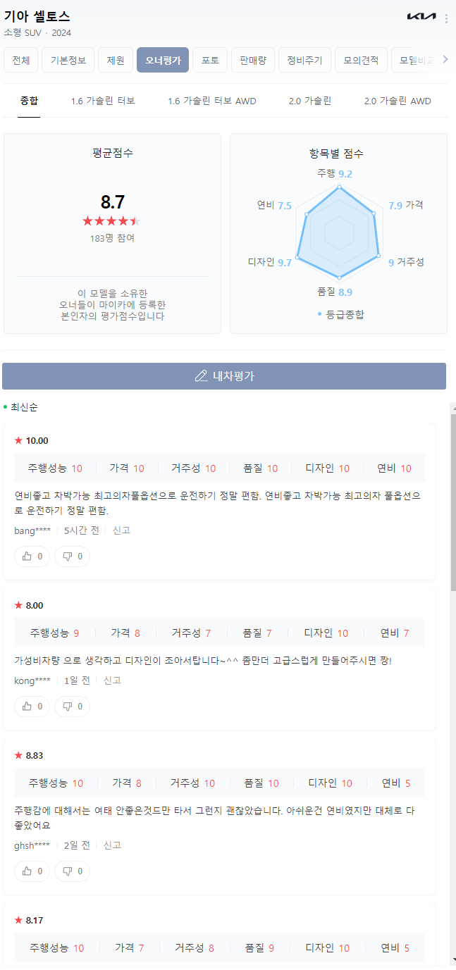 - 평점은 나쁘지 않네요 8.7입니다. 내용이 다양하지만 전반적인 평가로는 연비가 매우 아쉽다는 평가가 많았지만 여러 가지 옵션을 따져보았을 때 가성비가 매우 좋다는 평가가 많았습니다.