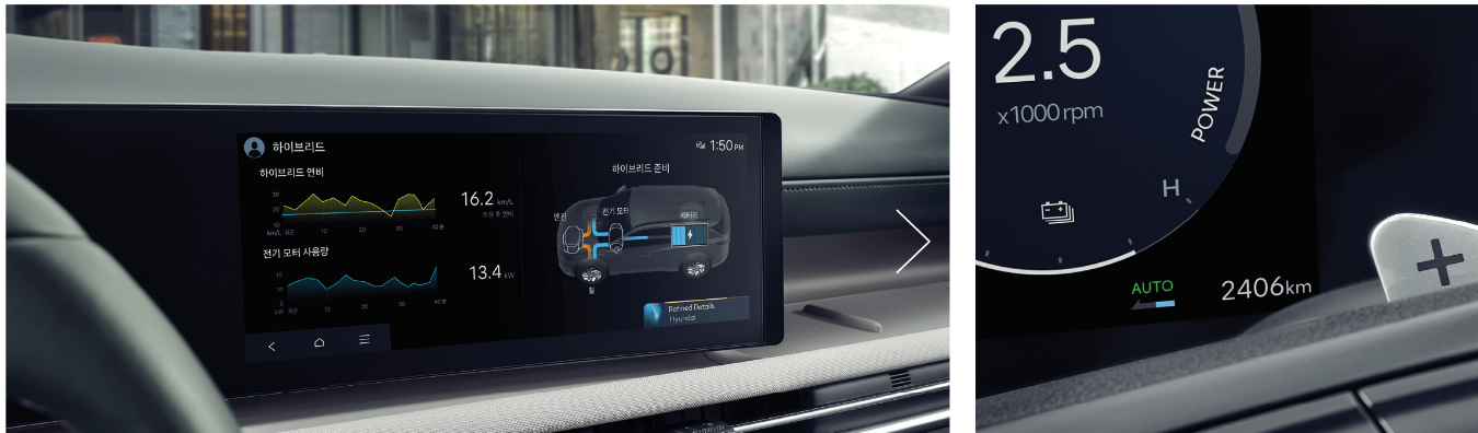 하이브리드 모델 답게 연비, 에너지흐름도, ECO 드라이빙등 전용화면이 나와 좀 더 시각적으로 확인할수 있는 부분이 많으며, 회생제동 모드가 주의상황에 따라 오토로 작동하면서 좀더 운전의 편의성이 좋아졌습니다.