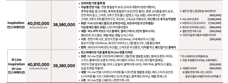 가격은 33,560,000원~40,810,000원 사이로 옵션과 N라인 여부에 따라 700만 원 정도 차이가 납니다.