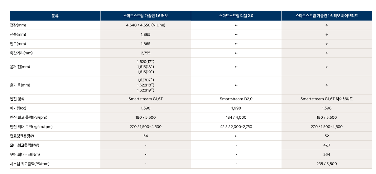 가격은 33,560,000원~40,810,000원 사이로 옵션과 N라인 여부에 따라 700만 원 정도 차이가 납니다.