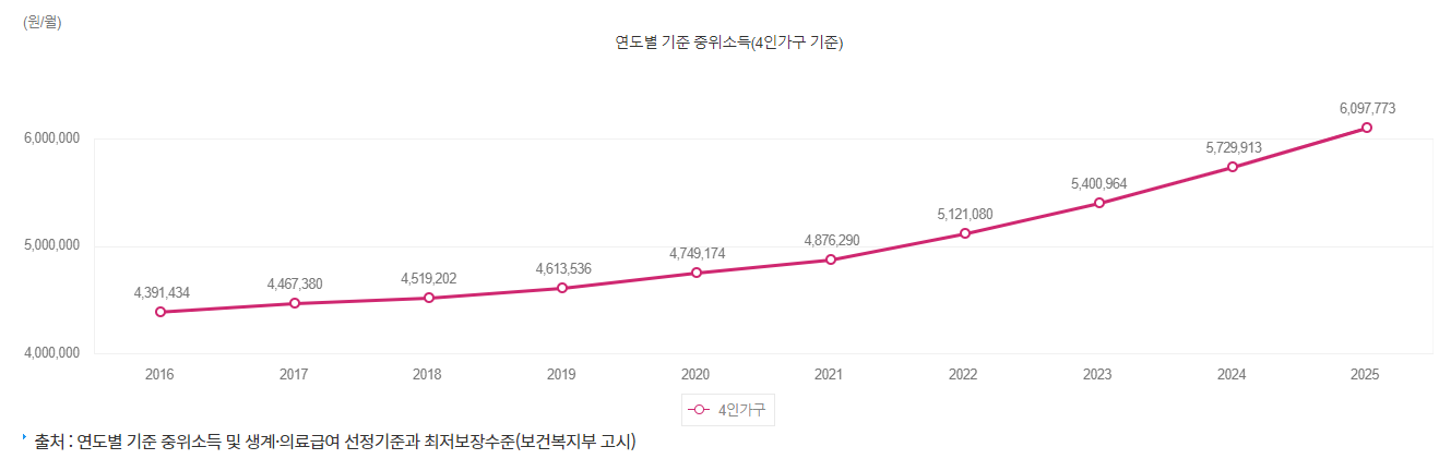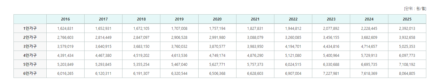 | 기준 중위소득 | 2,392,013 | 3,932,658 | 5,025,353 | 6,097,773 | 7,108,192 | 8,064,805 |