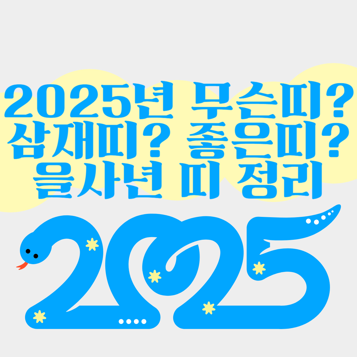 2025년 을사년, 여러분 모두에게 특별한 한 해가 되길 바라요. 삼재띠신 분들도 너무 걱정하지 마시고, 오히려 적극적으로 도전하고 발전하는 계기로 삼으세요.