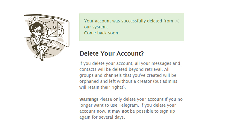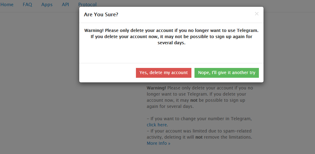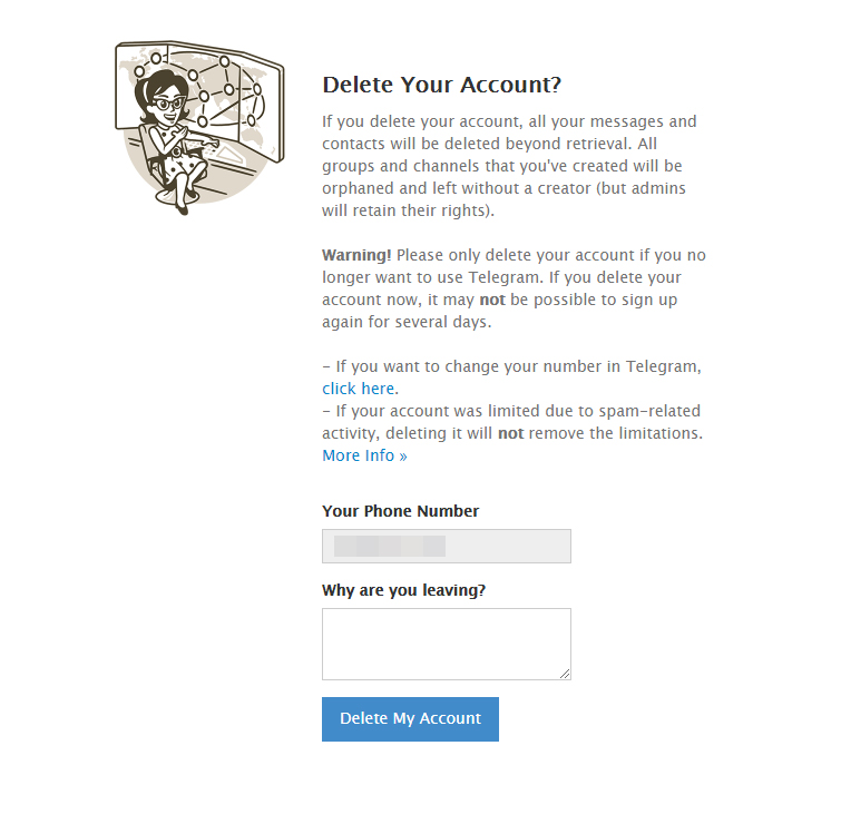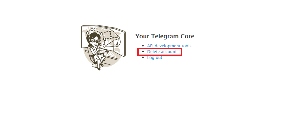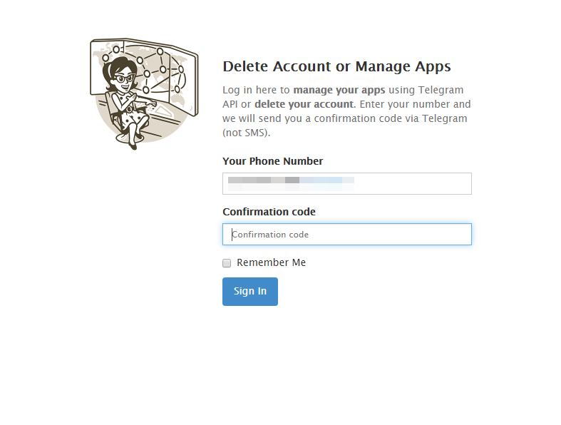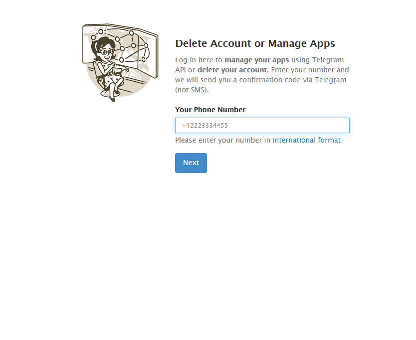 Delete Account or Manage Apps Log in here to manage your apps using Telegram API or delete your account. Enter your number and we will send you a confirmation code via Telegram (not SMS).