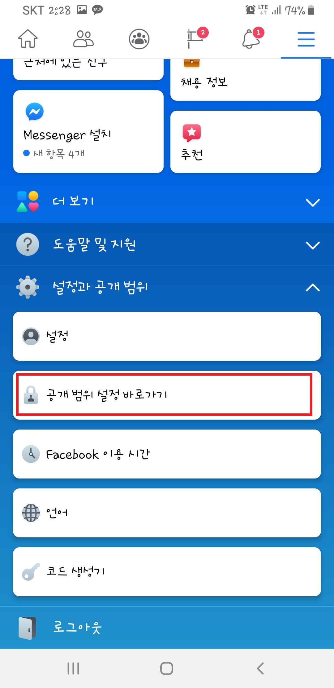 그중에 "설정과 공개범위" 메뉴에 해당하는 "공개 범위 설정바로가기" 클릭해줍니다.