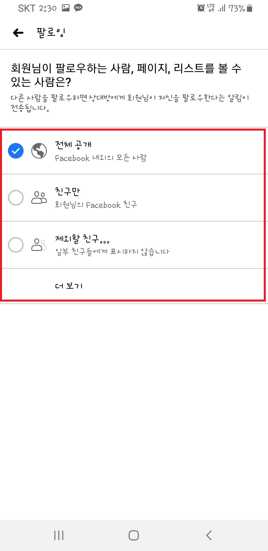 "공개범위설정" 메뉴에 들어가면 밑 부분에 "내활동"에 "회원님이 팔로우하는 사람 페이지 리스트 볼수있는 사람?" 메뉴를 클릭하시면 됩니다.