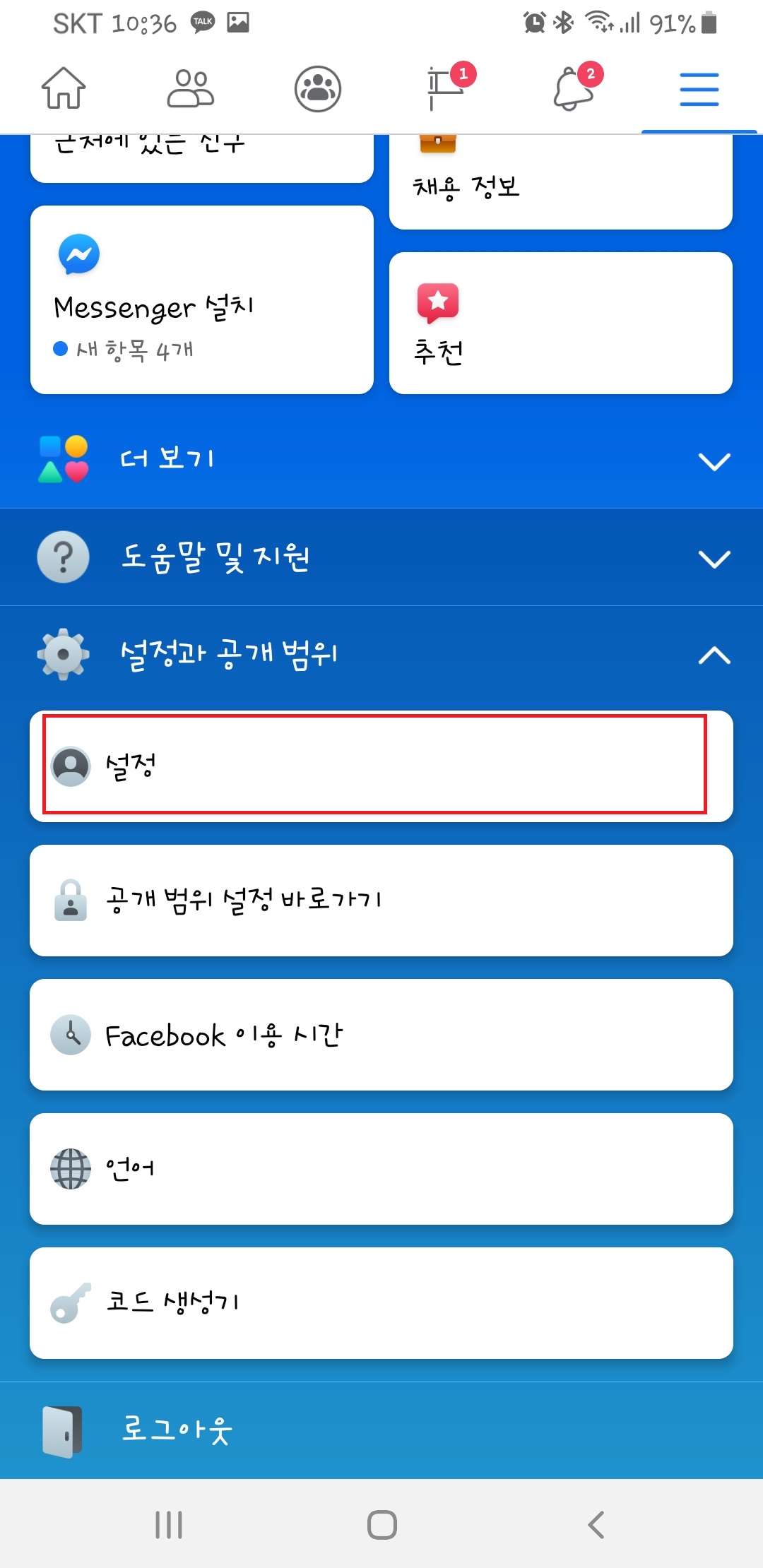 설정에 들어가게 되면 아래와 같은 화면이 나오는데 그중에 "설정 과 공개 범위"클릭!
