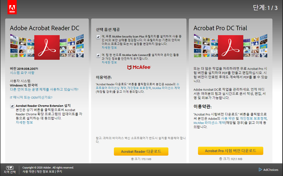 어도비 pdf 뷰어를 다운로드 받을때 약간 끼어 넣기 식으로 "McAfee"를 설치하겠금 유도를 합니다.