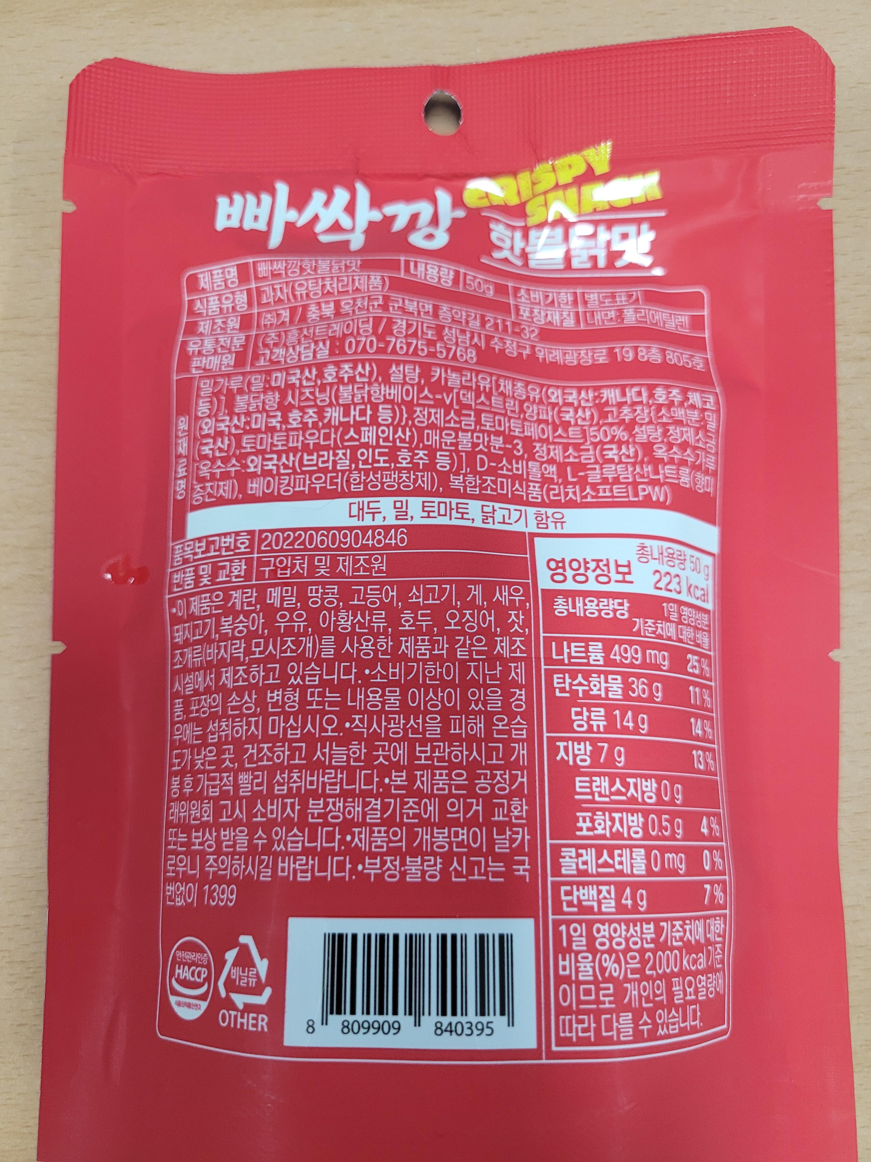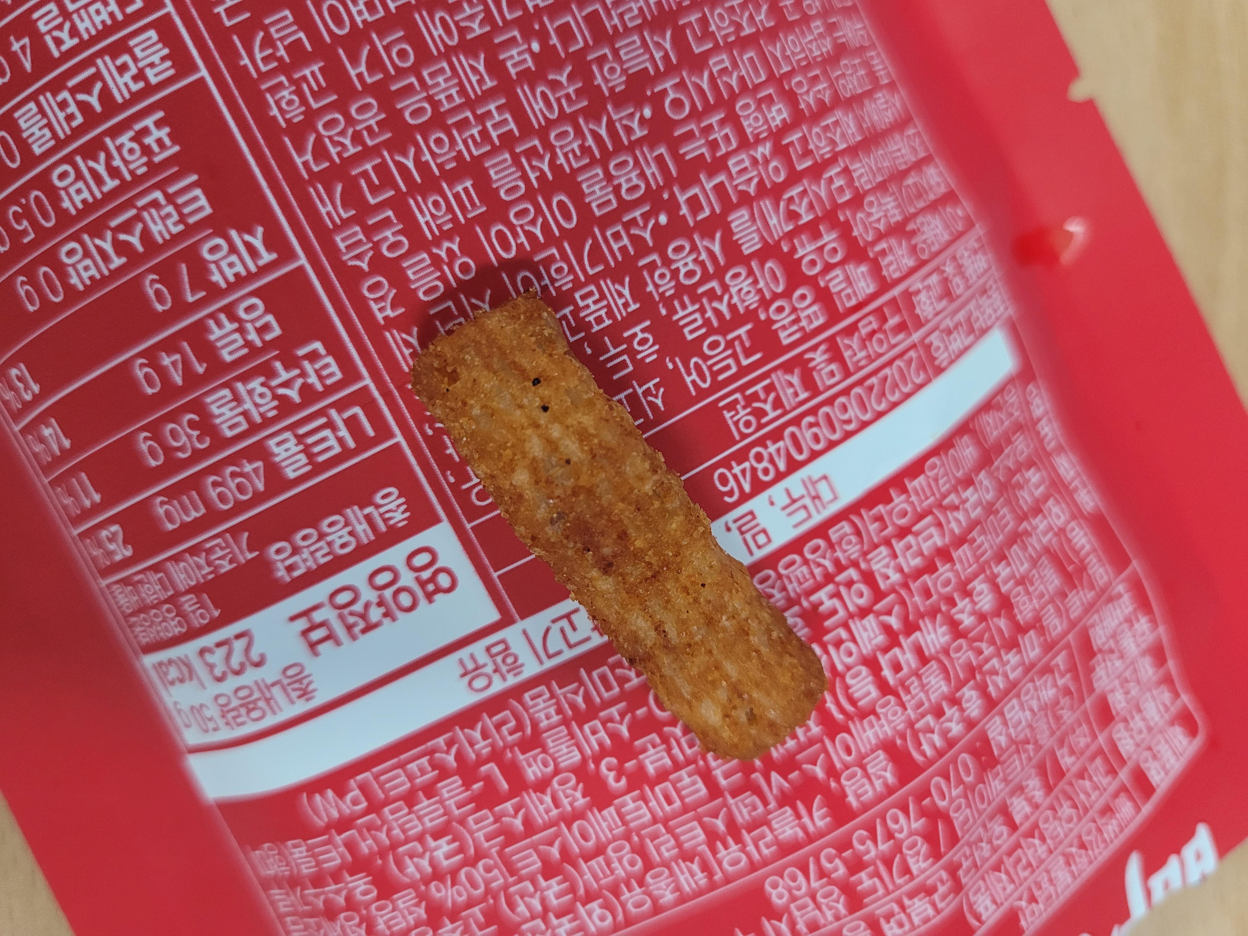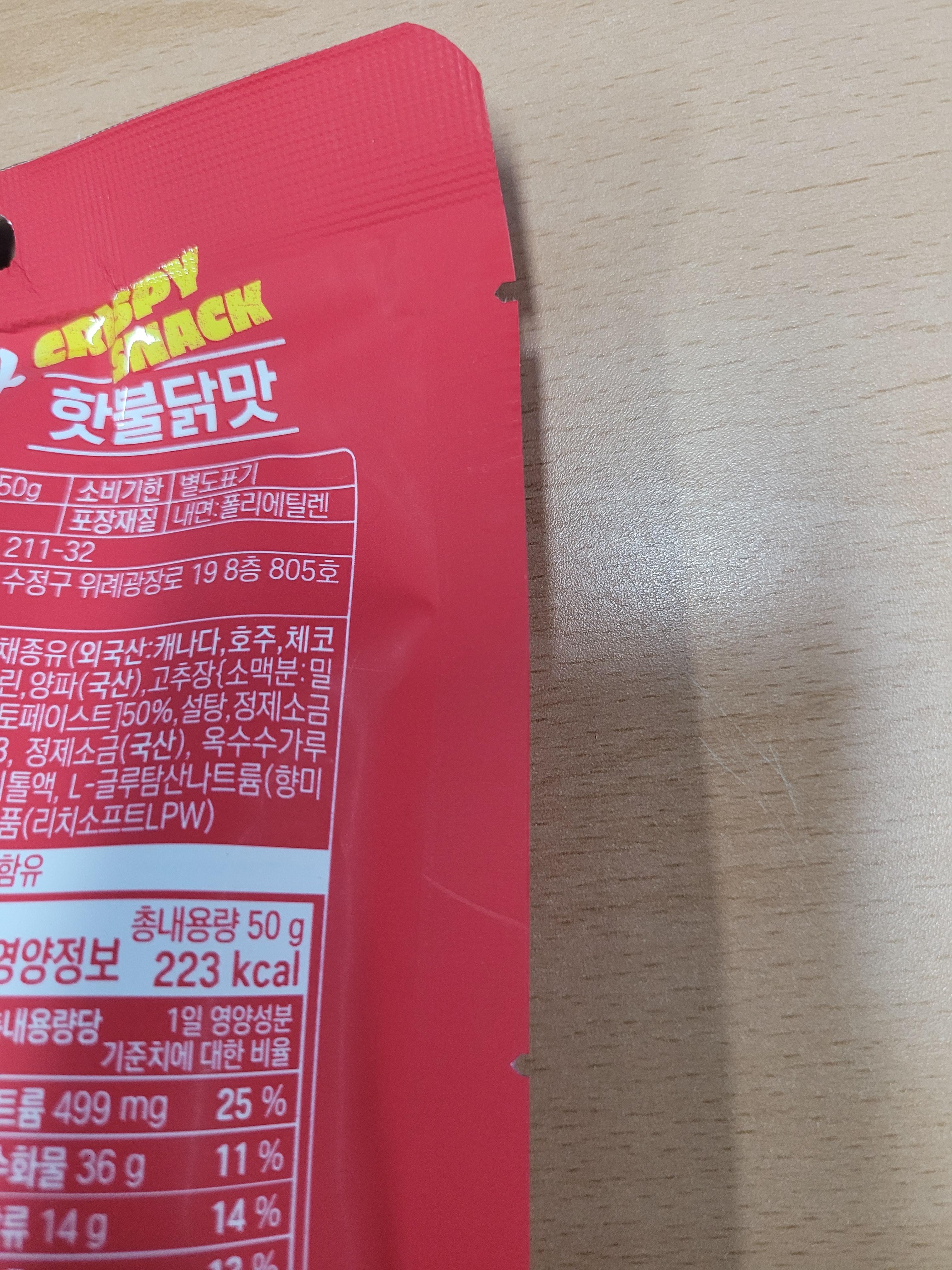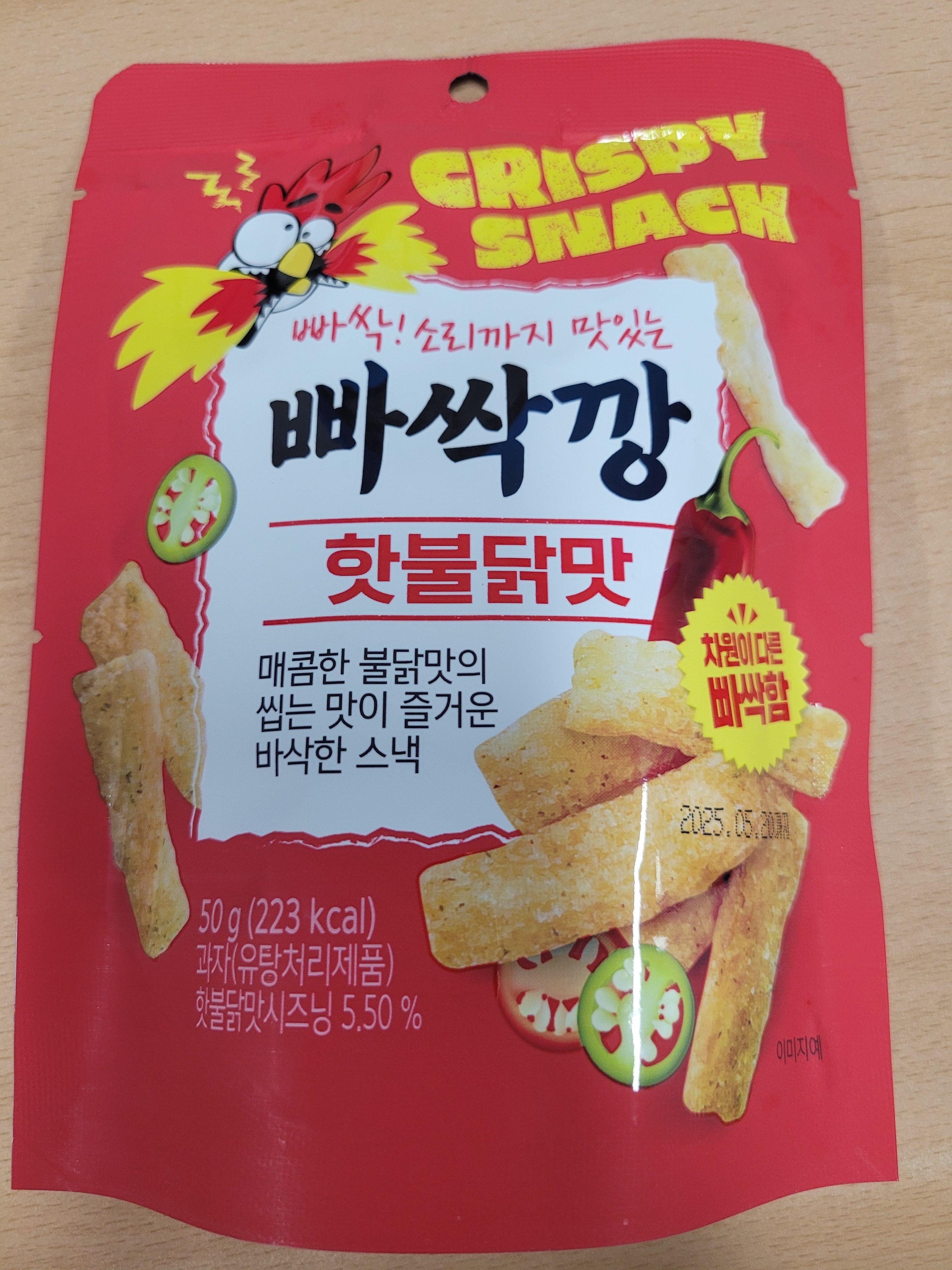먼저 매운 맛입니다. 매콤한 불닭맛의 씹는 맛이 즐거운 바삭한 스낵이라도 표현되어 있네요.