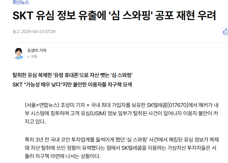 현재 SK텔레콤이 해킹 공격을 받아 일부 고객의 유심(USIM) 정보가 유출되었다고 합니다. 유출된 정보에는 IMSI, IMEI, 유심 인증키 등이 포함되어 있으며, 이는 '심 스와핑'을 통한 자산 탈취에 악용될 수 있다고 합니다. SK텔레콤는 자구책 중 하나로 SKT 유심 보호서비스를 가입을 권유 하고 있습니다.
