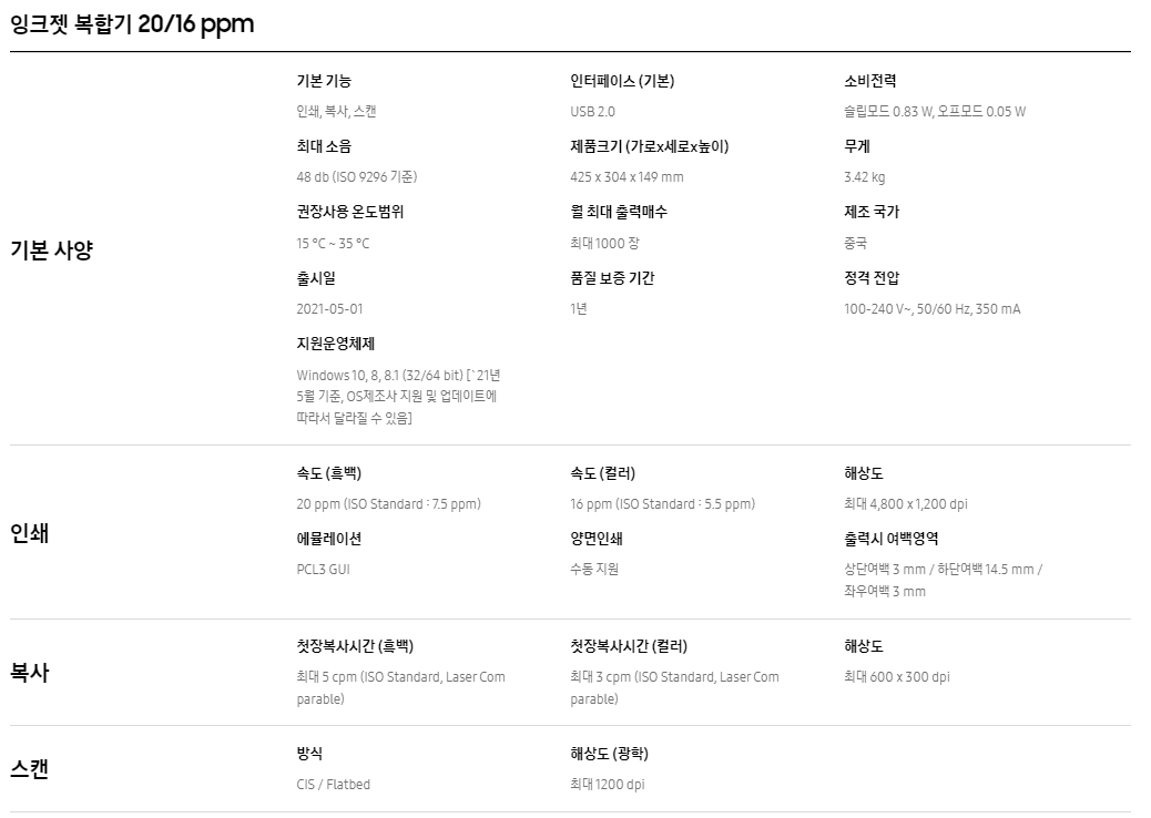 프린터, 복사기, 스캐너를 전부 구매할 수도 없고, 사용할 때마다 사무용품점이나 PC방에 가기 번거로우셨죠? 삼성 잉크젯 복합기 하나로 가정에서도 이미지를 고해상도로 스캔하여 PC로 전송할 수 있으며, 인쇄, 복사도 빠르고 편리하게 사용할 수 있습니다. 이제 집에서 과제나 문서 작성 시 인쇄, 복사, 스캔을 위한 불필요한 시간 절약은 물론, 더욱 효율적인 처리가 가능합니다. 고해상도 지원으로 포토 프린터로도 사용하세요 최대 4,800 x 1,200 dpi 고해상도 출력은 물론, Scan 광학해상도도 1,200 x 1,200 dpi로 높아 복사 시에도 뛰어난 화질입니다. 또한, A5, A6, Letter 등의 다양한 크기의 용지를 지원하여, 포토 프린터로도 사용할 수 있습니다. 20% 이상 늘어난 잉크 용량으로 부담없이 출력하세요 기존 모델(SL-J1663) 대비 잉크 카트리지 용량을 20 % 이상 늘여 출력비용 부담을 크게 낮추었어요. 흑백 잉크 카트리지는 50매 늘어난 최대 240매, 칼라는 35매 늘어난 최대 200매까지 출력하실 수 있습니다. USB 연결만으로 간단하게 설치가 가능합니다. USB 연결 후, 설치 프로그램 화면에서 알려주는 대로 따라 하기만 하면 바로 설치하실 수 있습니다. 취소, 다시 시작(출력재개), 흑백/컬러 복사, 전원버튼과 잉크부족 알림으로 이루어진 단순한 조작부로 누구나 사용하기 쉽습니다. 소형 사이즈로 다양한 공간에서 간편하게 설치하여 사용할 수 있습니다. 인테리어에 어울리는 화이트 컬러로 책상 위는 물론 거실 등 사용자가 원하는 곳에 올려두고 사용할 수 있어 효율적인 공간 배치가 가능합니다. Microsoft의 신규 O/S Windows 10을 탑재한 PC를 구입하셔도 프린터 구동이 가능한 드라이버를 다운로드 받아 설치하여 사용하실 수 있습니다. Samsung 프린터 길잡이로 스캔, 복사 소프트웨어 등 주요 작업과 예상 잉크량 체크는 물론, 각종 기능 설정, 도움말을 손쉽게 이용할 수 있습니다.