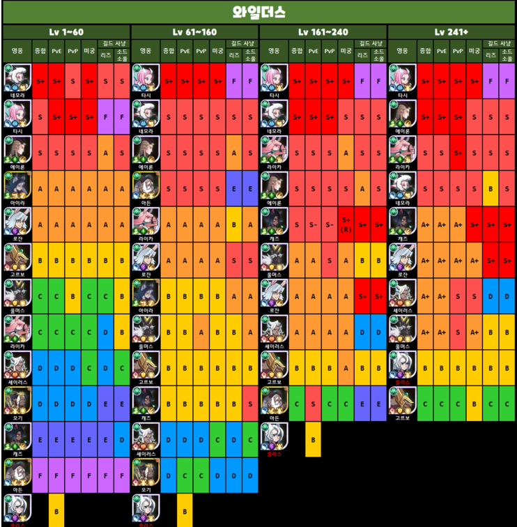 그래서 가성비좋은 케릭터 찾으면서 등급표를 찾다보니 여기저기서 마다 달라서 종합적으로 한번 정리를 해봤습니다.