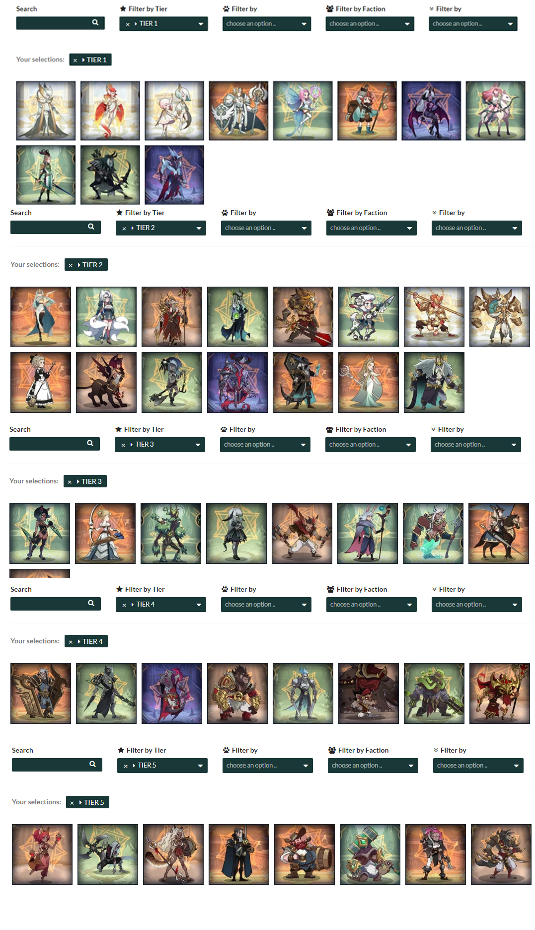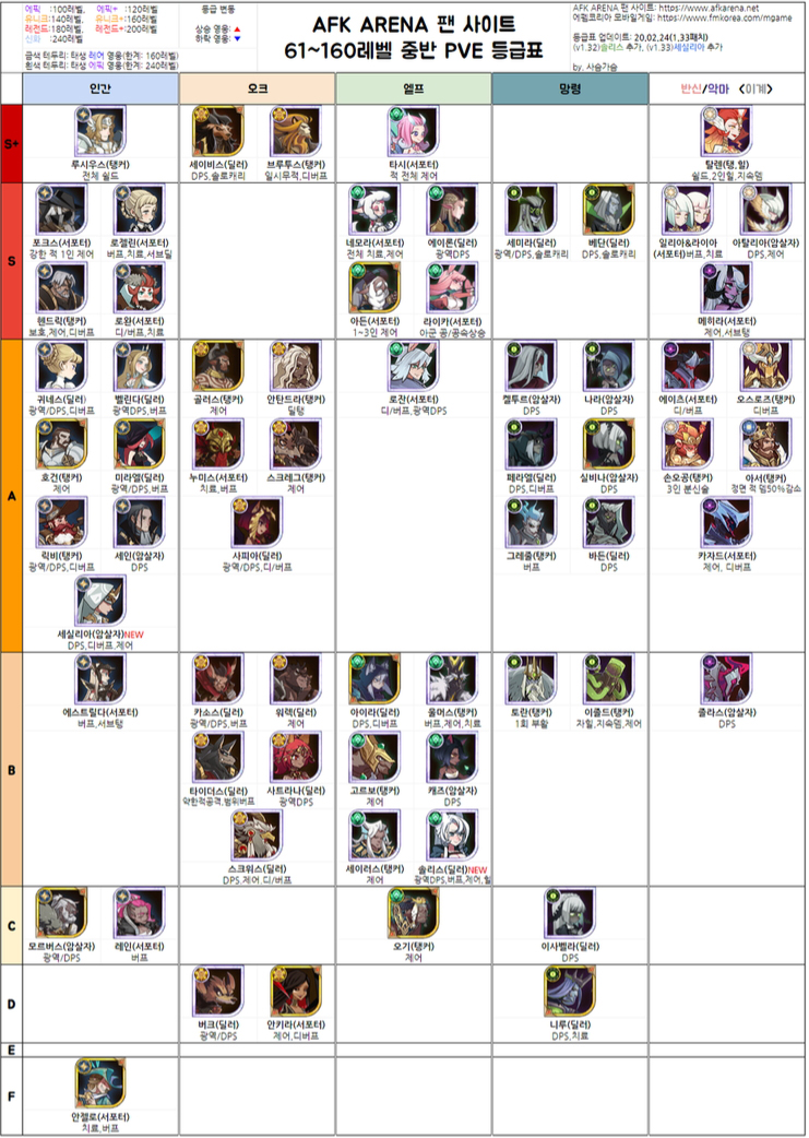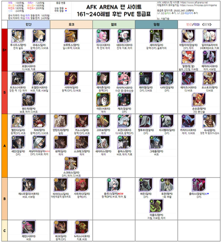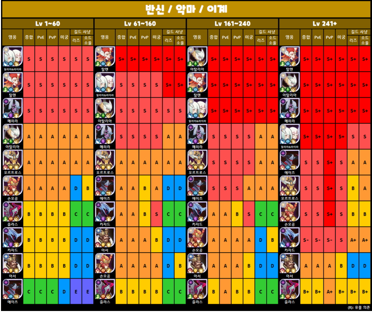 afk 아레나 등급표를 싹 모아봤습니다. 결국 보면 반신이나 악마가 능력치나 스킬이 좋기 때문에 기회가 뽑기해서 운좋게 나온다면 주력으로 쓰시는게 좋습니다