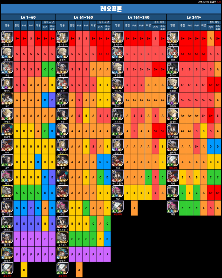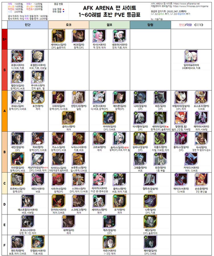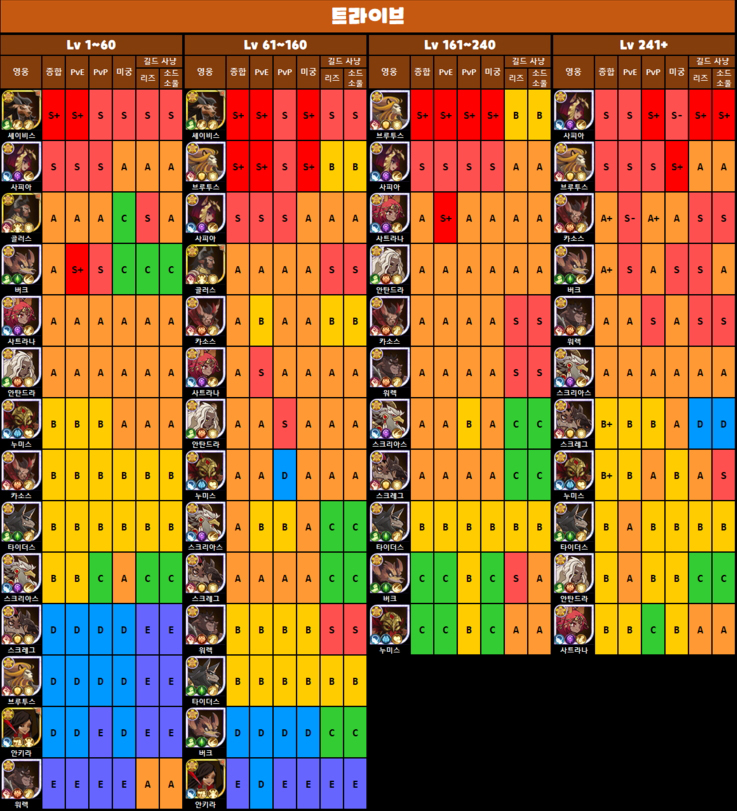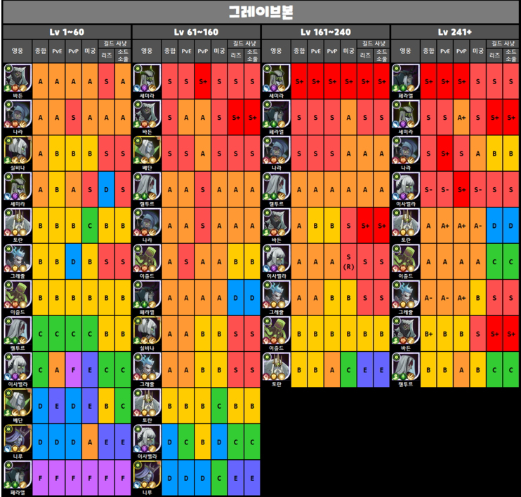 그래서 가성비좋은 케릭터 찾으면서 등급표를 찾다보니 여기저기서 마다 달라서 종합적으로 한번 정리를 해봤습니다.