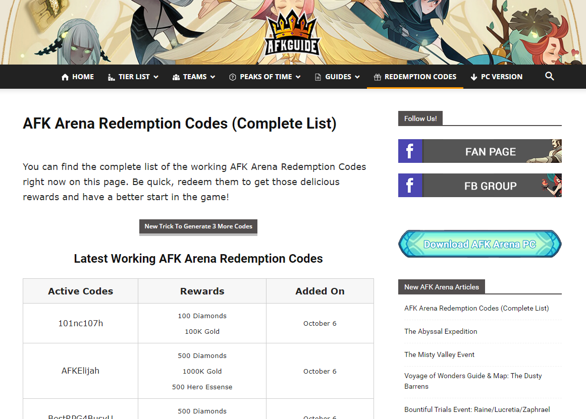 현재까지 나온 쿠폰 목록이며, 쿠폰 업데이트는 AFK 아레나 게시판에서도 찾을수 있지만 중복되는 경우가 있어서 중복없이 찾아볼수 있는 해외 싸이트를 소개해드립니다.
