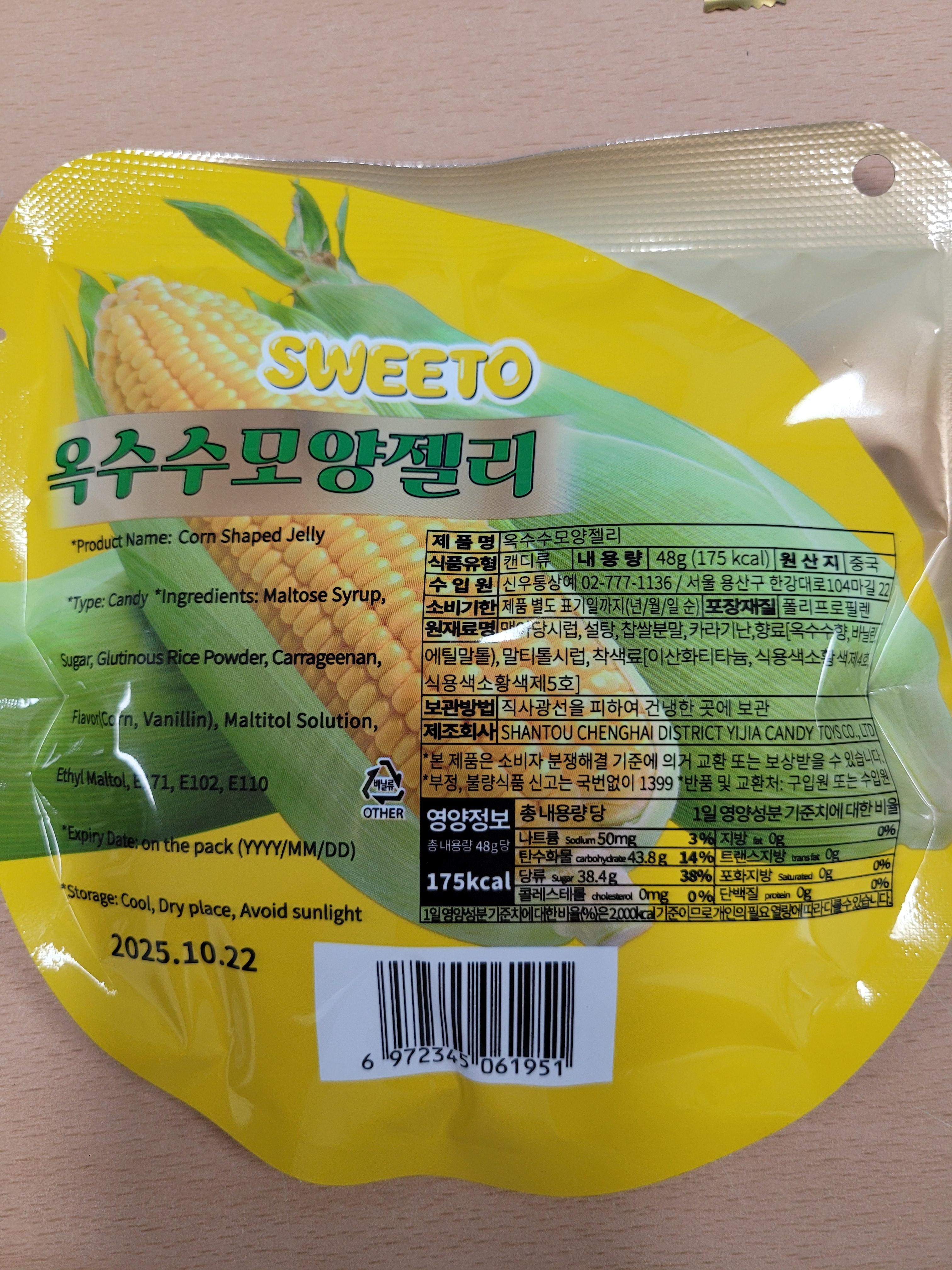 포장은 SWEETO 옥수수모양젤리라고 적어져 있습니다.