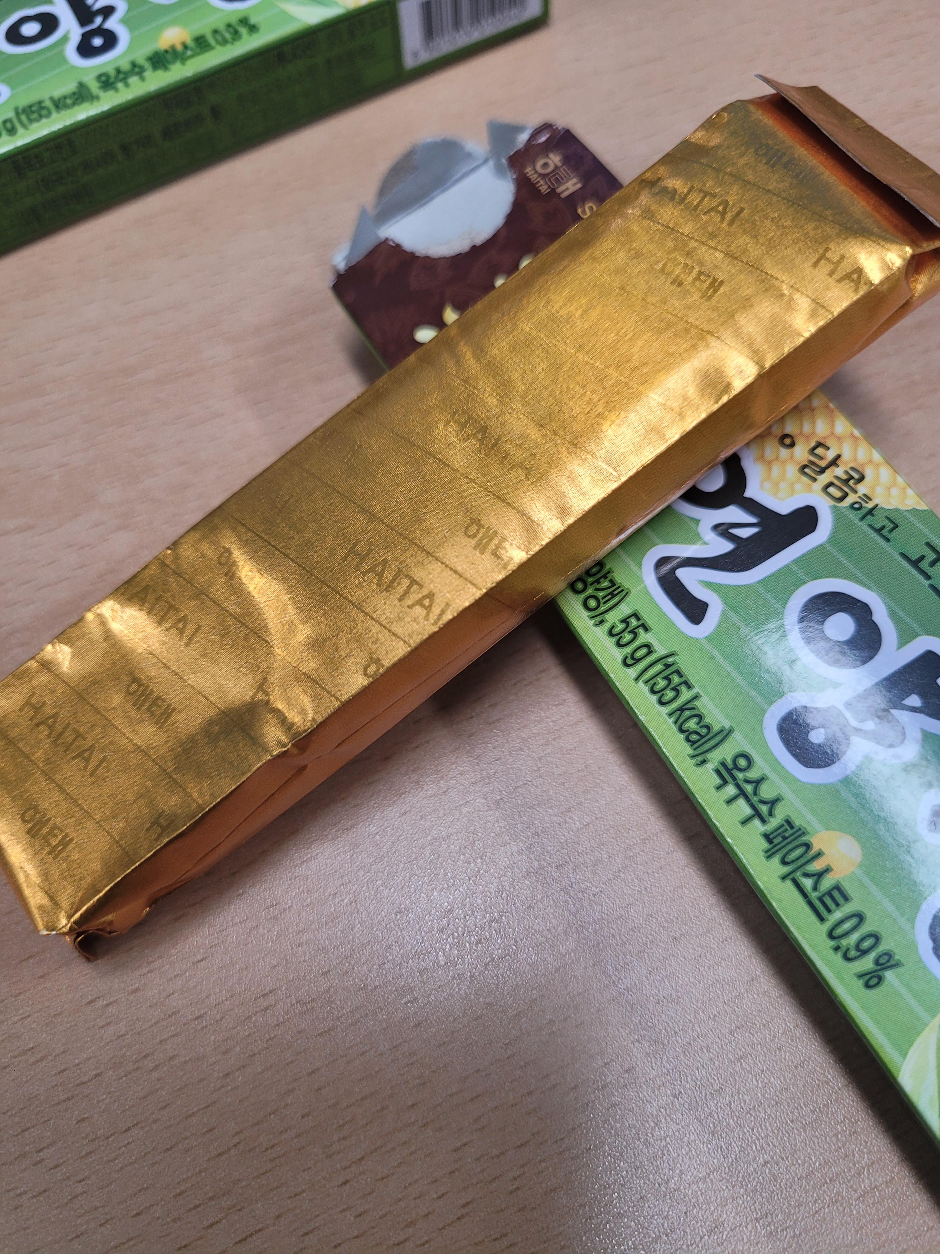 포장지를 뜯었는데 향은 옥수수 향이 나기는 하는 밤양갱과 크게 모양이 다르지 않네요.